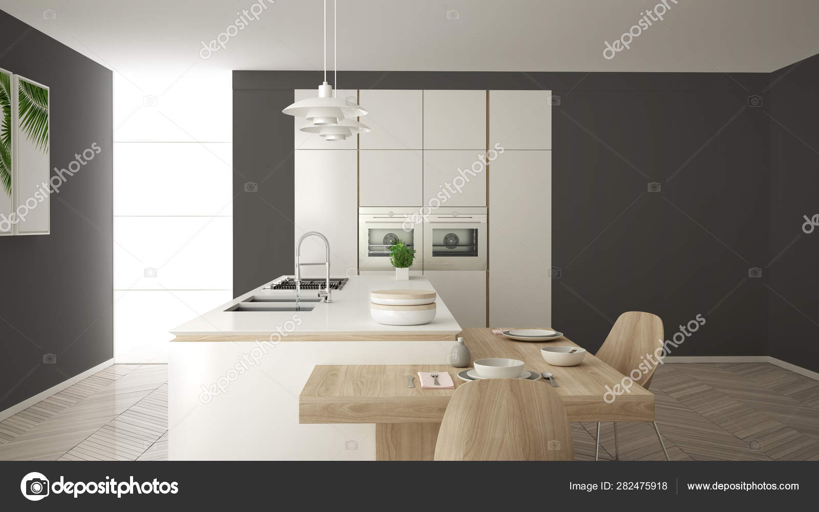 Modern Clean Contemporary White Kitchen Island And Wooden Dining