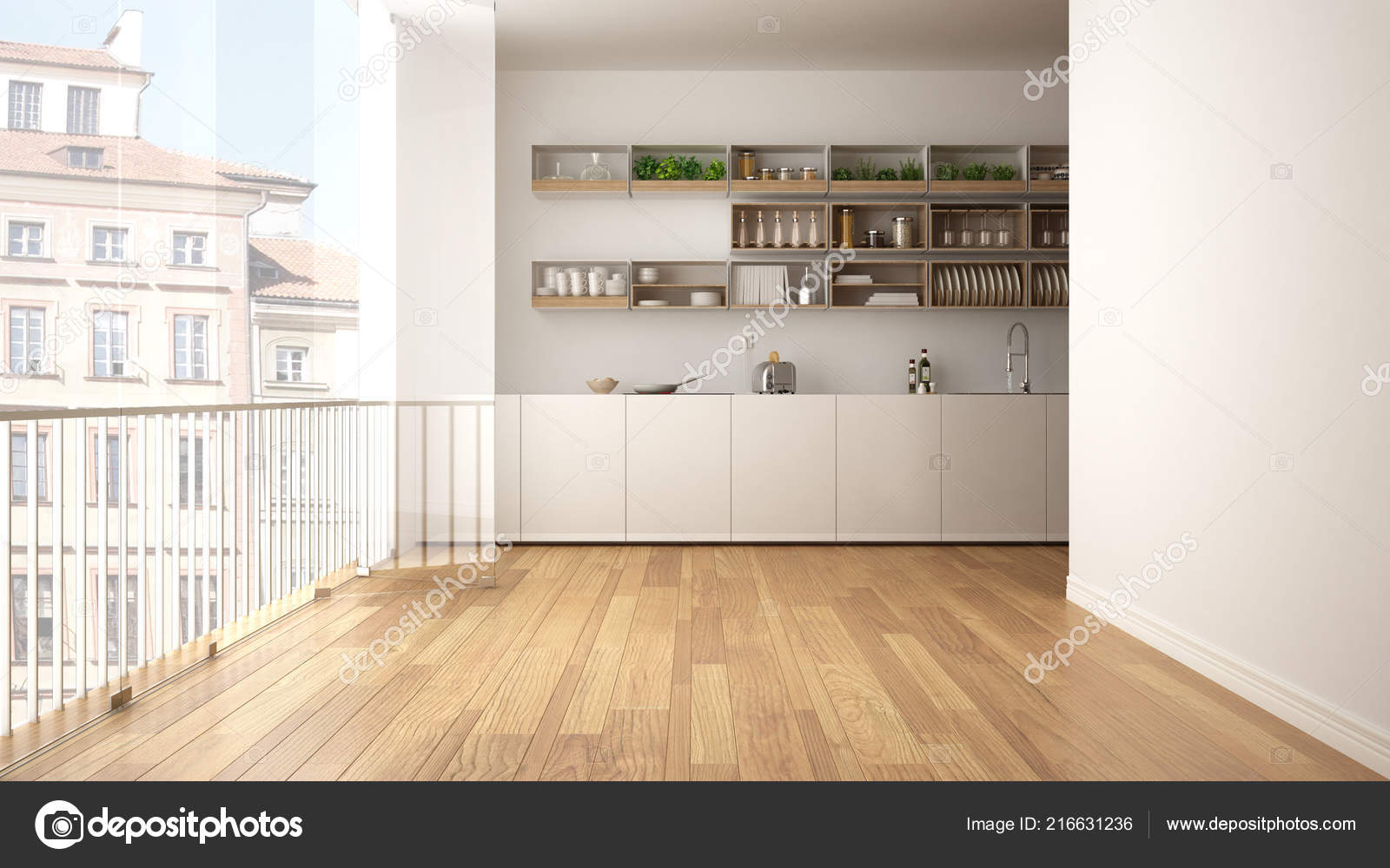 Minimalist White And Wooden Kitchen With Parquet Floor And Big